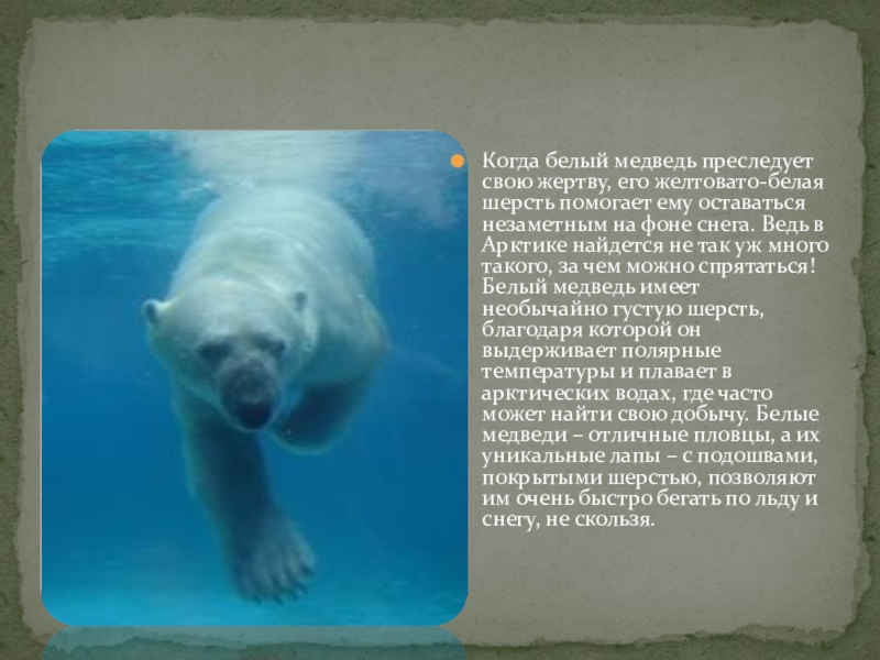 Слайд 16Когда белый медведь преследует свою жертву, его желтовато-белая шерсть помогает ему