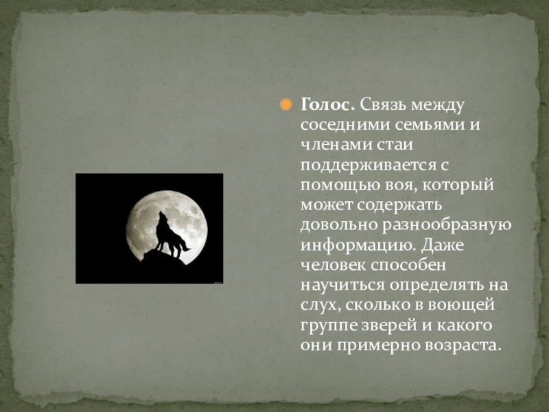 который может содержать довольно разнообразную информацию. Даже человек способен научиться определять на слух, сколько в воющей группе зверей и какого они примерно возраста.