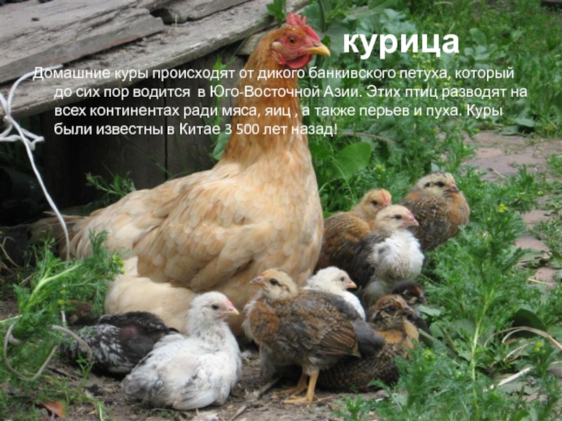 Домашние куры происходят от дикого банкивского петуха, который до сих пор водится в Юго-Восточной Азии. Этих птиц разводят на всех континентах ради мяса, яиц , а также перьев и пуха. Куры были известны в Китае 3 500 лет назад!