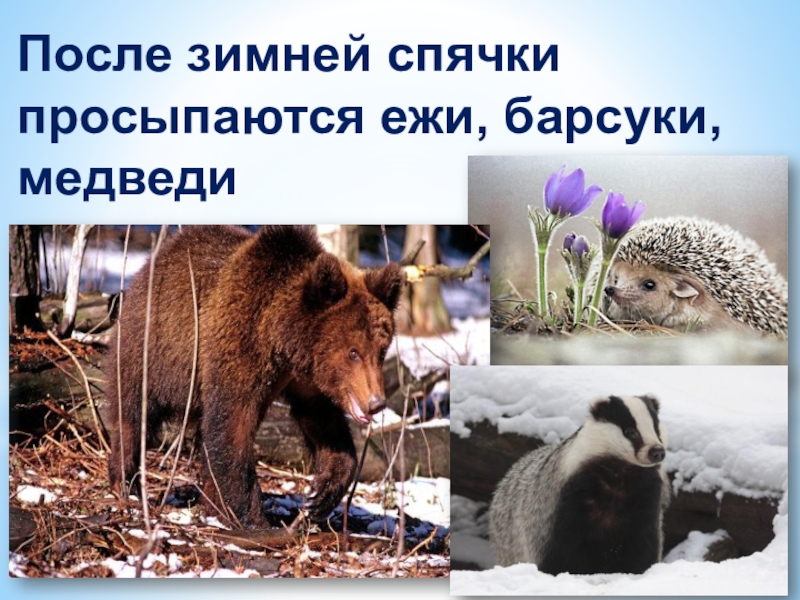 Слайд 18После зимней спячки просыпаются ежи, барсуки, медведи