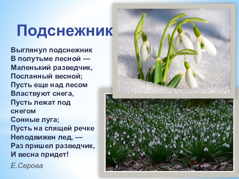ПодснежникВыглянул подснежник В полутьме лесной — Маленький разведчик, Посланный весной; Пусть еще над лесом Властвуют снега, Пусть лежат под