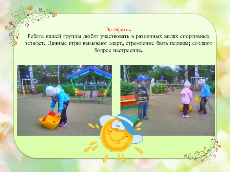 Эстафеты.Ребята нашей группы любят участвовать в различных видах спортивных эстафет. Данные игры вызывают азарт, стремление быть первым;