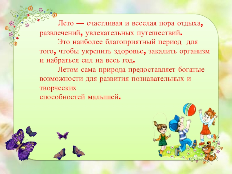 Лето — счастливая и веселая пора отдыха, развлечений, увлекательных путешествий. Это наиболее благоприятный период  для того, чтобы укрепить здоровье, закалить организм и набраться сил на весь год.