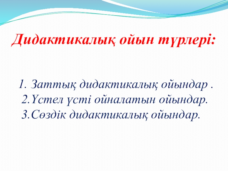 Дидактикалық ойын түрлері:1. Заттық дидактикалық ойындар . 2.Үстел үсті ойналатын ойындар. 3.Сөздік дидактикалық ойындар.