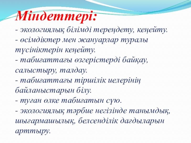 Слайд 3Міндеттері: - экологиялық білімді тереңдету, кеңейту. - өсімдіктер мен жануарлар туралы