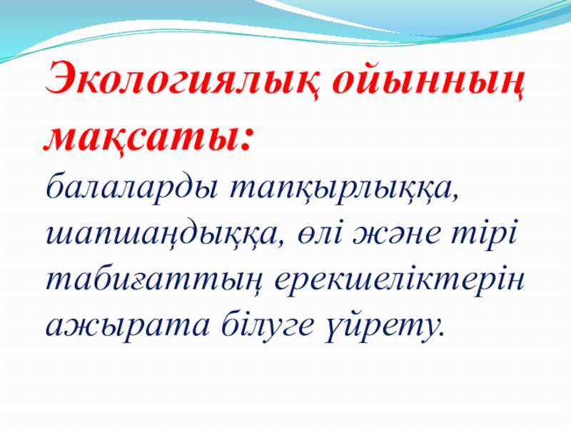 Экологиялық ойынның мақсаты: балаларды тапқырлыққа, шапшаңдыққа, өлі және тірі табиғаттың ерекшеліктерін