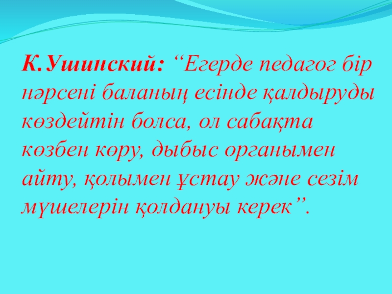 К.Ушинский: “Егерде педагог бір нәрсені баланың есінде қалдыруды көздейтін болса, ол сабақта көзбен көру, дыбыс
