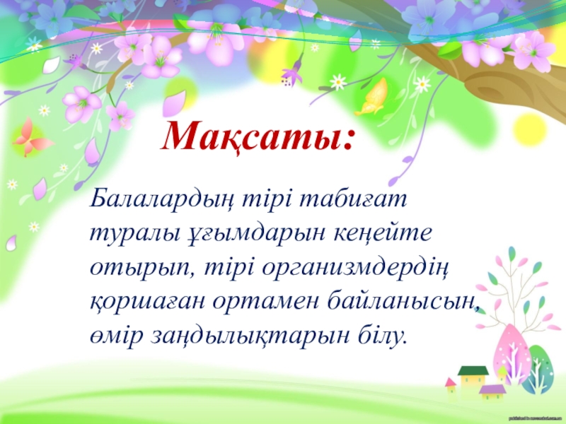 Мақсаты:Балалардың тірі табиғат туралы ұғымдарын кеңейте отырып, тірі организмдердің қоршаған ортамен байланысын, өмір заңдылықтарын білу.