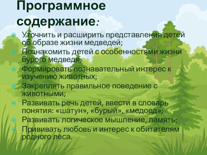 Программное содержание:Уточнить и расширить представления детей об образе жизни медведей;Познакомить детей с особенностями жизни бурого медведя;Формировать познавательный интерес к изучению животных;Закреплять правильное поведение с животными;Развивать речь детей, ввести в словарь понятия: «шатун», «бурый», «медоед»;Развивать логическое мышление,
