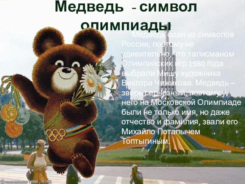 что талисманом Олимпийских игр 1980 года выбрали Мишу художника Виктора Чижикова. Медведь – зверь серьезный, поэтому у него на Московской Олимпиаде были не только имя, но даже отчество и фамилия, звали его Михайло Потапычем Топтыгиным.