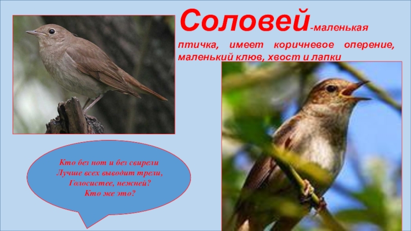 Соловей-маленькая птичка, имеет коричневое оперение, маленький клюв, хвост и лапки