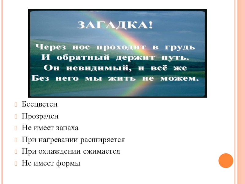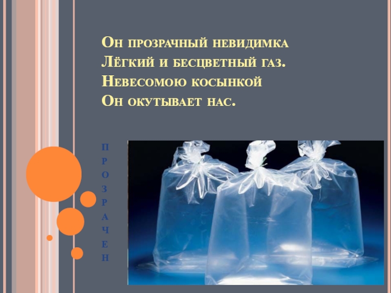 Он прозрачный невидимка Лёгкий и бесцветный газ. Невесомою косынкой Он окутывает нас. ПРОЗРАЧЕН