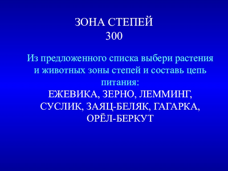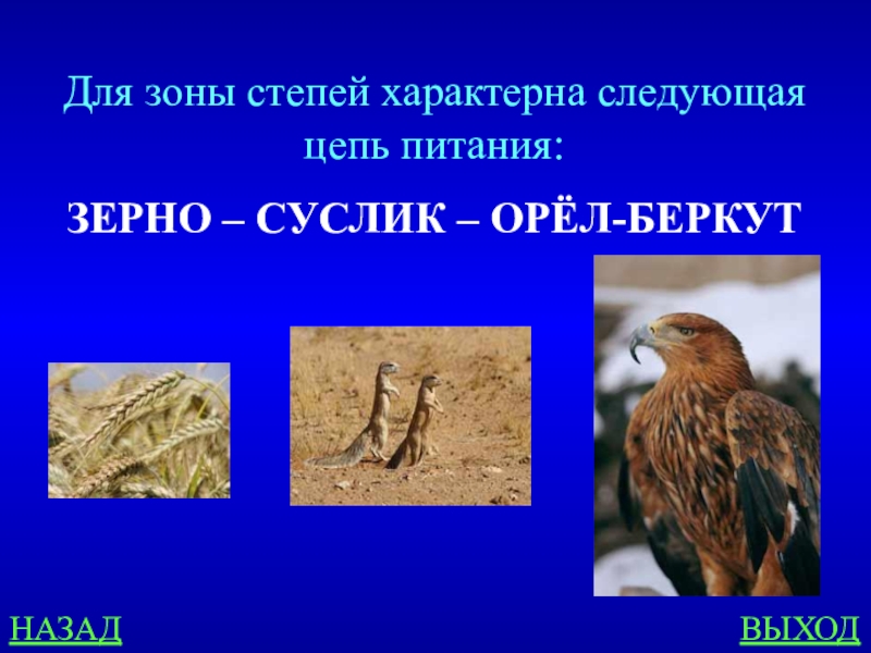 НАЗАДВЫХОДДля зоны степей характерна следующая цепь питания:ЗЕРНО – СУСЛИК – ОРЁЛ-БЕРКУТ