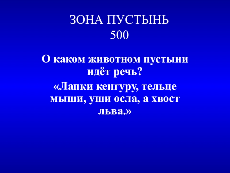 ЗОНА ПУСТЫНЬ 500О каком животном пустыни идёт речь?«Лапки кенгуру, тельце мыши, уши осла, а хвост льва.»