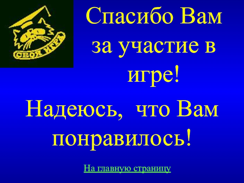 Спасибо Вам за участие в игре!Надеюсь, что Вам понравилось!На главную страницу