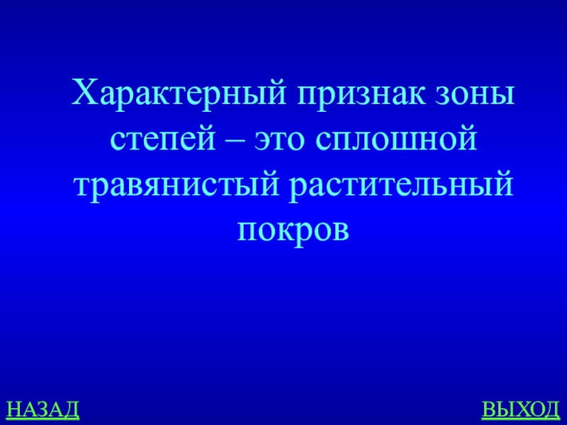 НАЗАДВЫХОДХарактерный признак зоны степей – это сплошной травянистый растительный покров