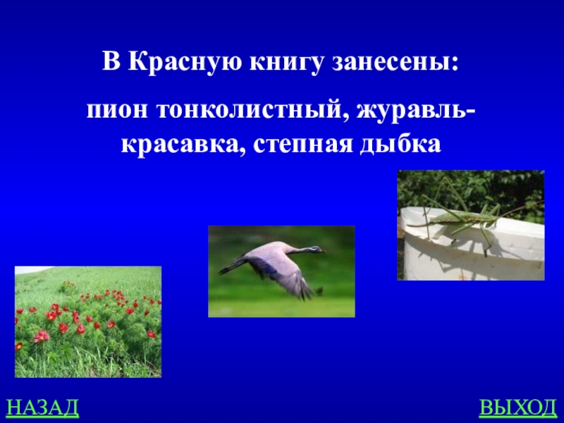 НАЗАДВЫХОДВ Красную книгу занесены: пион тонколистный, журавль-красавка, степная дыбка
