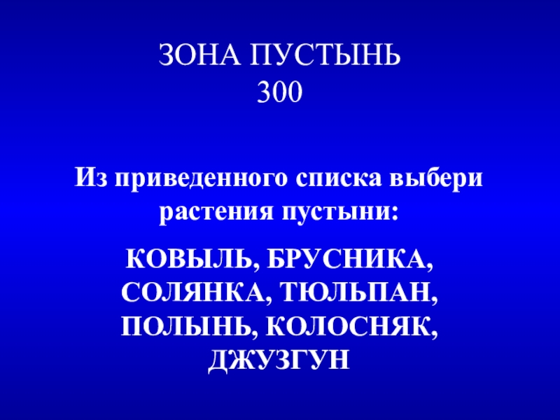 ЗОНА ПУСТЫНЬ 300Из приведенного списка выбери растения пустыни:КОВЫЛЬ, БРУСНИКА, СОЛЯНКА, ТЮЛЬПАН, ПОЛЫНЬ, КОЛОСНЯК, ДЖУЗГУН