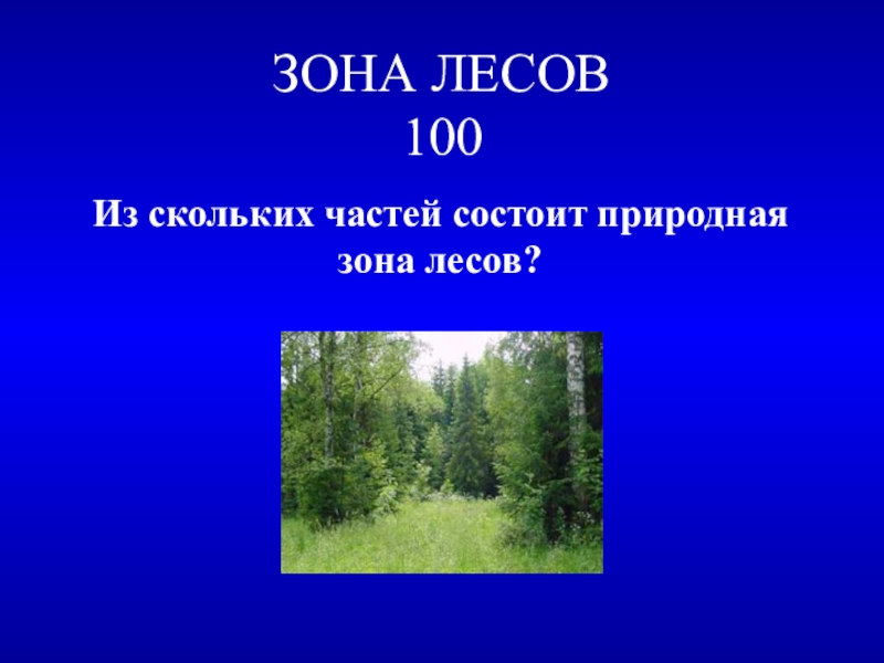 ЗОНА ЛЕСОВ 100Из скольких частей состоит природная зона лесов?