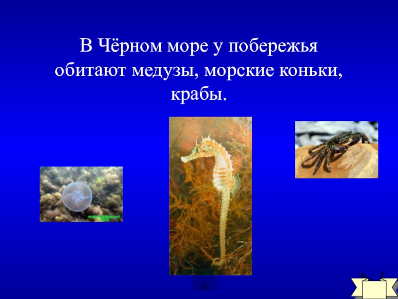 В Чёрном море у побережья обитают медузы, морские коньки, крабы.