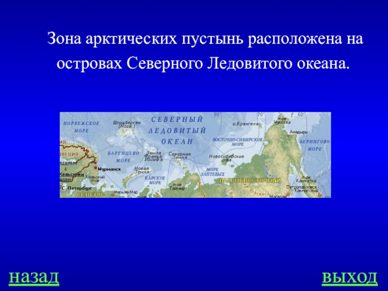 назадвыход Зона арктических пустынь расположена на островах Северного Ледовитого океана.
