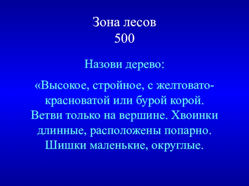 Зона лесов 500Назови дерево:«Высокое, стройное, с желтовато-красноватой или бурой корой. Ветви только на вершине. Хвоинки длинные, расположены
