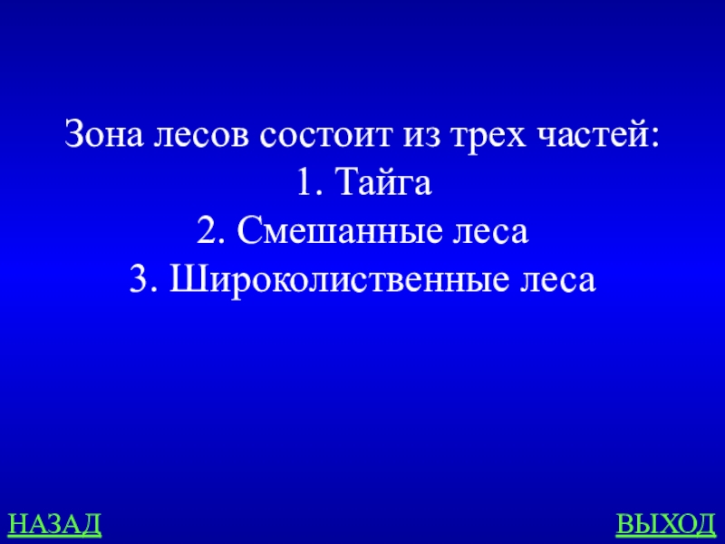 НАЗАДВЫХОДЗона лесов состоит из трех частей: 1. Тайга 2. Смешанные леса 3. Широколиственные леса