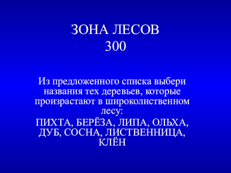 ЗОНА ЛЕСОВ 300Из предложенного списка выбери названия тех деревьев, которые произрастают в широколиственном лесу:ПИХТА, БЕРЁЗА, ЛИПА, ОЛЬХА,