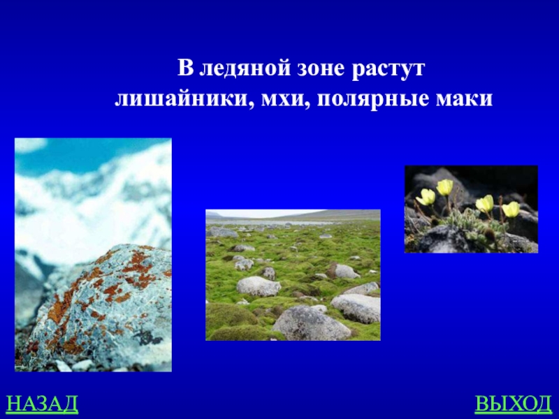 НАЗАДВЫХОДВ ледяной зоне растут  лишайники, мхи, полярные маки