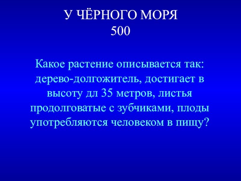 У ЧЁРНОГО МОРЯ 500 Какое растение описывается так: дерево-долгожитель, достигает в высоту дл 35 метров, листья продолговатые