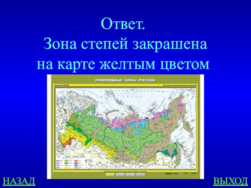 НАЗАДВЫХОДОтвет. Зона степей закрашена на карте желтым цветом