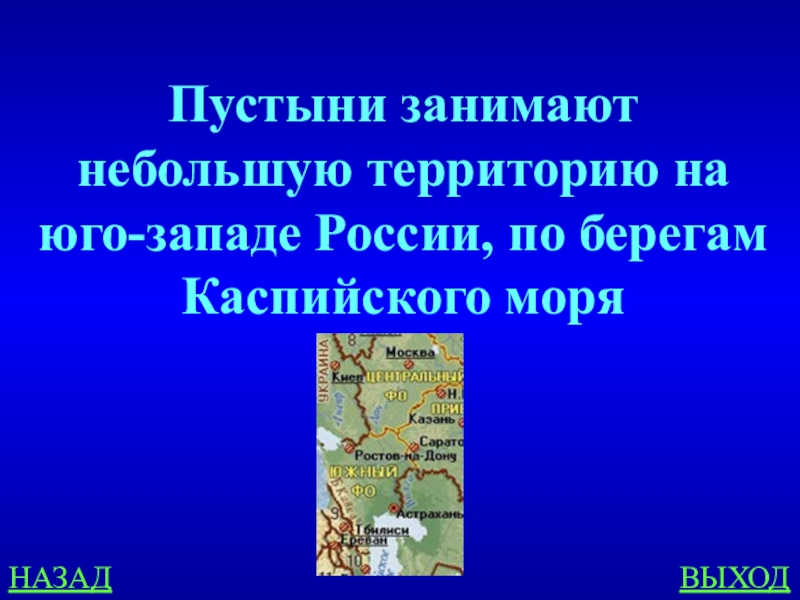 НАЗАДВЫХОДПустыни занимают небольшую территорию на юго-западе России, по берегам Каспийского моря