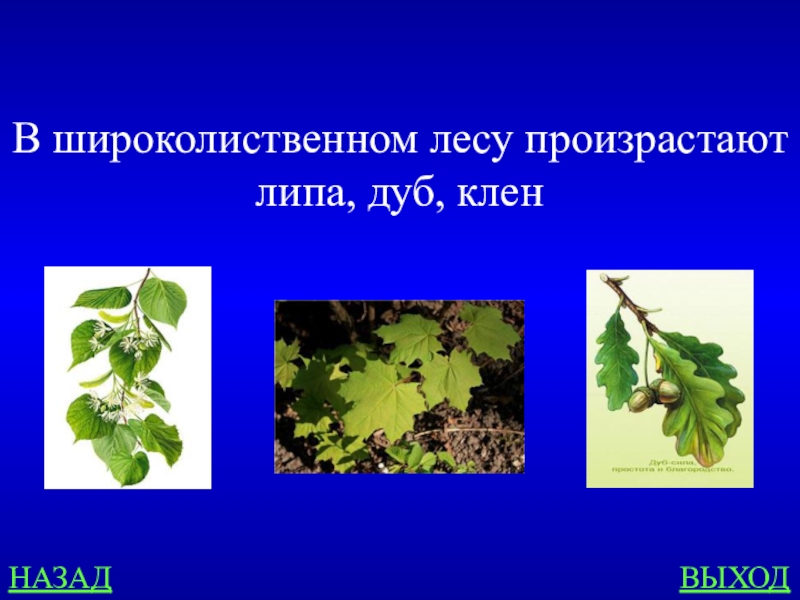 НАЗАДВЫХОДВ широколиственном лесу произрастают липа, дуб, клен
