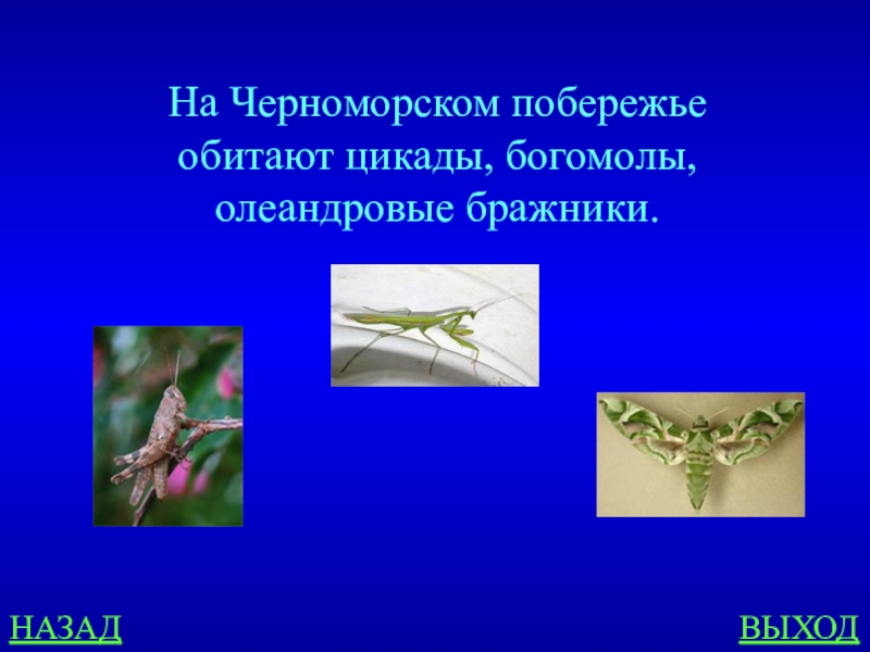 НАЗАДВЫХОДНа Черноморском побережье обитают цикады, богомолы, олеандровые бражники.