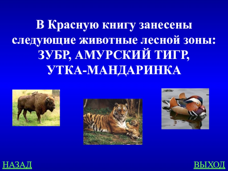 НАЗАДВЫХОДВ Красную книгу занесены следующие животные лесной зоны: ЗУБР, АМУРСКИЙ ТИГР,  УТКА-МАНДАРИНКА