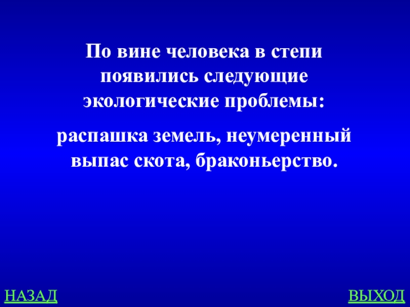 НАЗАДВЫХОДПо вине человека в степи появились следующие экологические проблемы:распашка земель, неумеренный выпас скота, браконьерство.