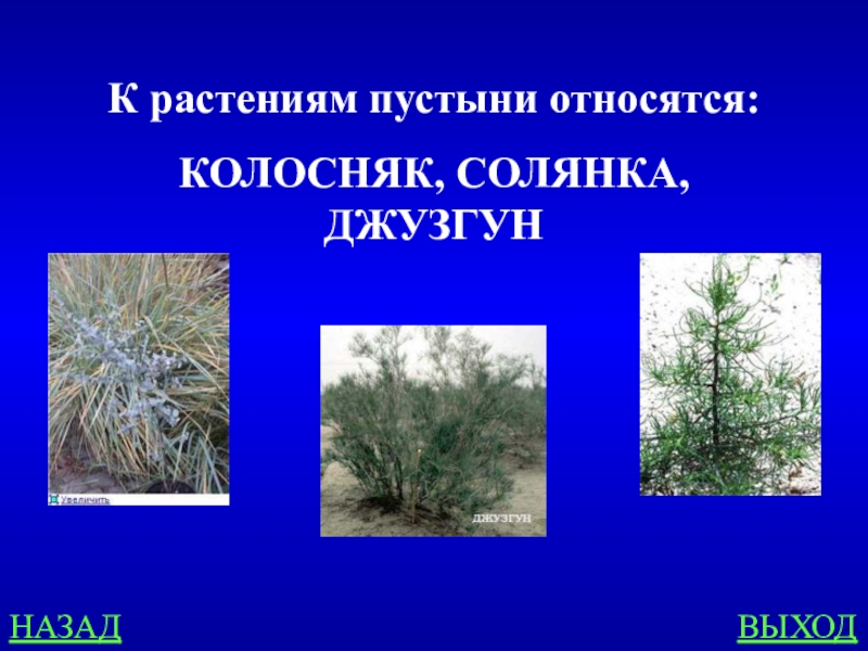 НАЗАДВЫХОДК растениям пустыни относятся:КОЛОСНЯК, СОЛЯНКА, ДЖУЗГУН
