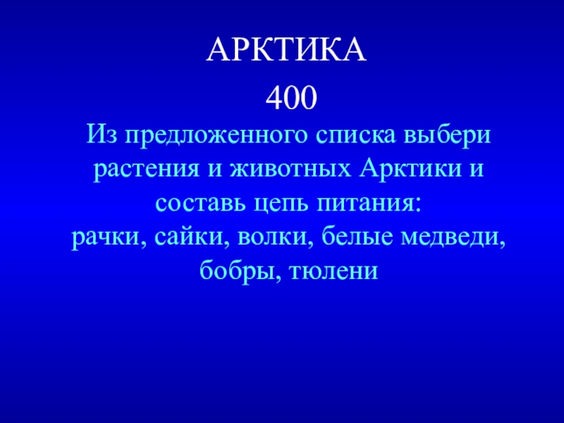 АРКТИКА  400 Из предложенного списка выбери растения и животных Арктики и составь цепь питания:рачки, сайки, волки,