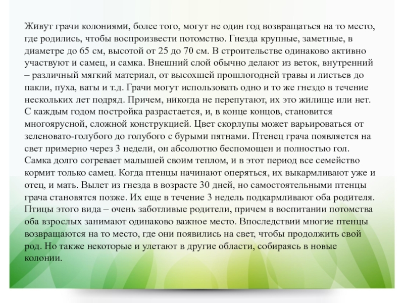 то место, где родились, чтобы воспроизвести потомство. Гнезда крупные, заметные, в диаметре до 65 см, высотой от 25 до 70 см. В строительстве одинаково активно участвуют и самец, и самка. Внешний слой обычно делают из веток, внутренний – различный мягкий материал, от высохшей прошлогодней травы и листьев до пакли, пуха, ваты и т.д. Грачи могут использовать одно и то же гнездо в течение нескольких лет подряд. Причем, никогда не перепутают, их это жилище или нет. С каждым годом постройка разрастается, и, в конце концов, становится многоярусной, сложной конструкцией. Цвет скорлупы может варьироваться от зеленовато-голубого до голубого с бурыми пятнами. Птенец грача появляется на свет примерно через 3 недели, он абсолютно беспомощен и полностью гол. Самка долго согревает малышей своим теплом, и в этот период все семейство кормит только самец. Когда птенцы начинают оперяться, их выкармливают уже и отец, и мать. Вылет из гнезда в возрасте 30 дней, но самостоятельными птенцы грача становятся позже. Их еще в течение 3 недель подкармливают оба родителя. Птицы этого вида – очень заботливые родители, причем в воспитании потомства оба взрослых занимают одинаково важное место. Впоследствии многие птенцы возвращаются на то место, где они появились на свет, чтобы продолжить свой род. Но также некоторые и улетают в другие области, собираясь в новые колонии.