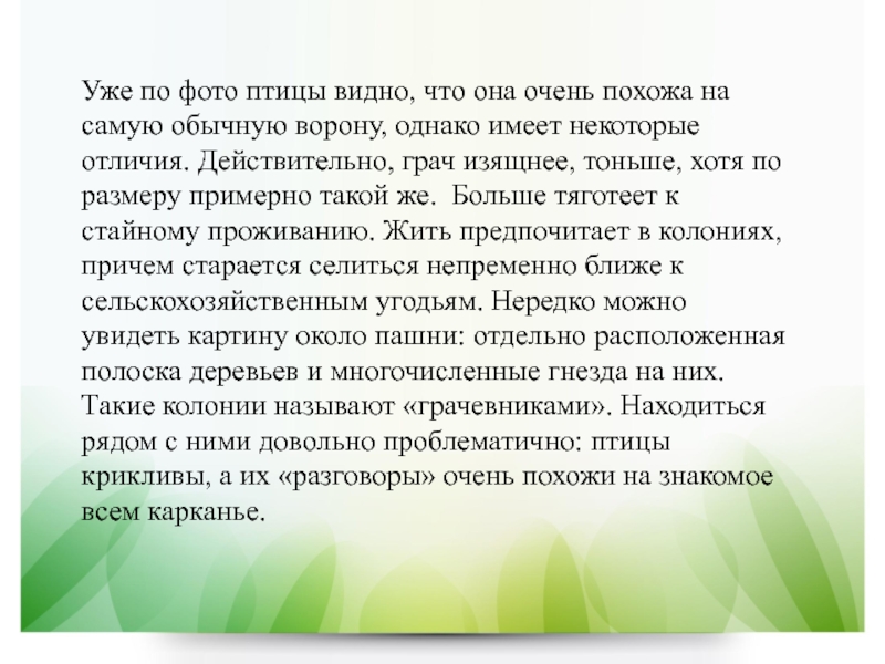 обычную ворону, однако имеет некоторые отличия. Действительно, грач изящнее, тоньше, хотя по размеру примерно такой же. Больше тяготеет к стайному проживанию. Жить предпочитает в колониях, причем старается селиться непременно ближе к сельскохозяйственным угодьям. Нередко можно увидеть картину около пашни: отдельно расположенная полоска деревьев и многочисленные гнезда на них. Такие колонии называют «грачевниками». Находиться рядом с ними довольно проблематично: птицы крикливы, а их «разговоры» очень похожи на знакомое всем карканье.