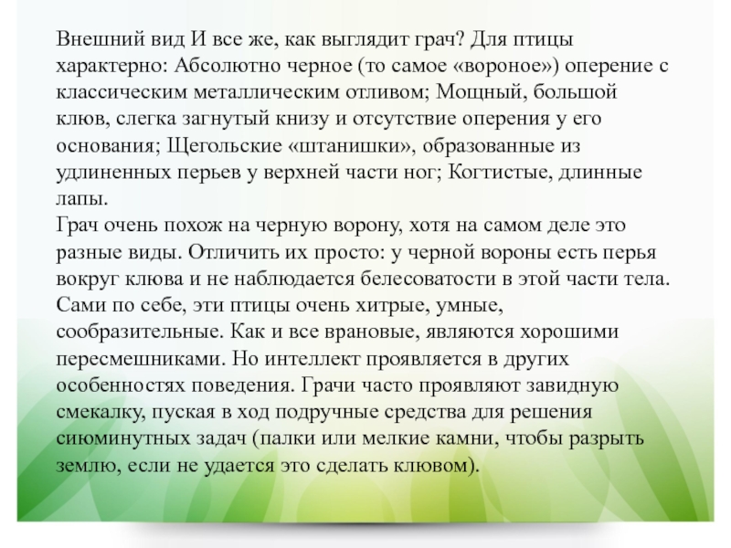 Грач очень похож на черную ворону, хотя на самом деле это разные виды. Отличить их просто: у черной вороны есть перья вокруг клюва и не наблюдается белесоватости в этой части тела. Сами по себе, эти птицы очень хитрые, умные, сообразительные. Как и все врановые, являются хорошими пересмешниками. Но интеллект проявляется в других особенностях поведения. Грачи часто проявляют завидную смекалку, пуская в ход подручные средства для решения сиюминутных задач (палки или мелкие камни, чтобы разрыть землю, если не удается это сделать клювом).