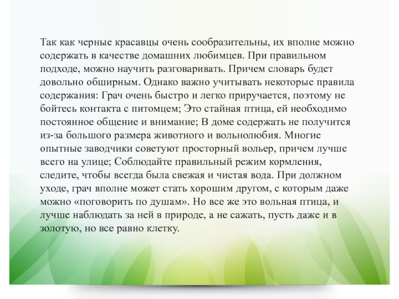 качестве домашних любимцев. При правильном подходе, можно научить разговаривать. Причем словарь будет довольно обширным. Однако важно учитывать некоторые правила содержания: Грач очень быстро и легко приручается, поэтому не бойтесь контакта с питомцем; Это стайная птица, ей необходимо постоянное общение и внимание; В доме содержать не получится из-за большого размера животного и вольнолюбия. Многие опытные заводчики советуют просторный вольер, причем лучше всего на улице; Соблюдайте правильный режим кормления, следите, чтобы всегда была свежая и чистая вода. При должном уходе, грач вполне может стать хорошим другом, с которым даже можно «поговорить по душам». Но все же это вольная птица, и лучше наблюдать за ней в природе, а не сажать, пусть даже и в золотую, но все равно клетку.