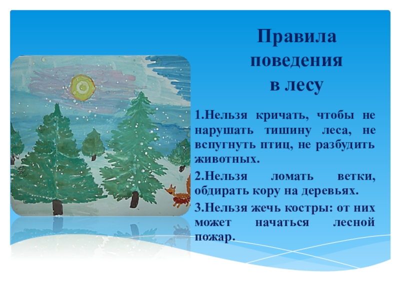 1.Нельзя кричать, чтобы не нарушать тишину леса, не вспугнуть птиц, не разбудить животных.