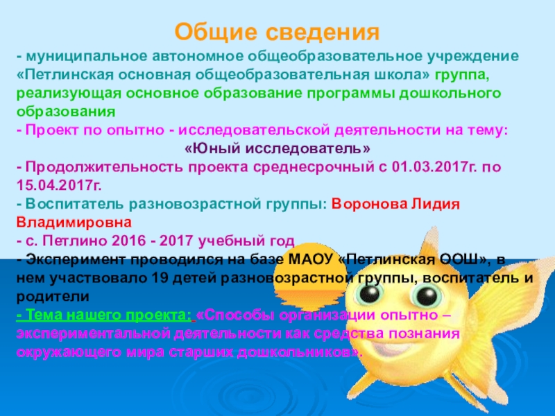 - Эксперимент проводился на базе МАОУ «Петлинская ООШ», в нем участвовало 19 детей разновозрастной группы, воспитатель и родители