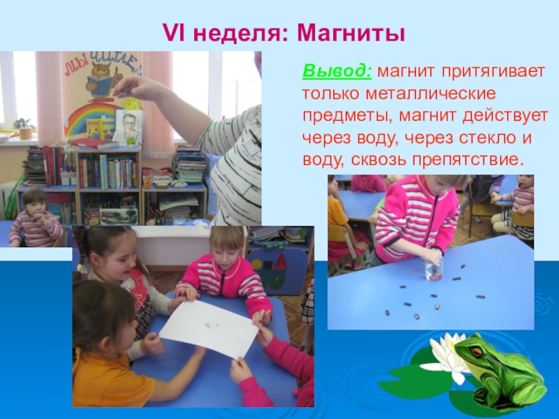 Вывод: магнит притягивает только металлические предметы, магнит действует через