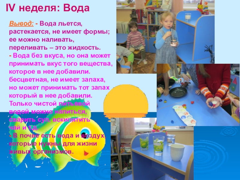 Вывод: - Вода льется, растекается, не имеет формы; ее