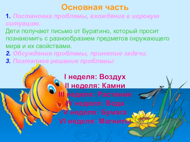 Буратино, который просит познакомить с разнообразием предметов окружающего мира и их свойствами.