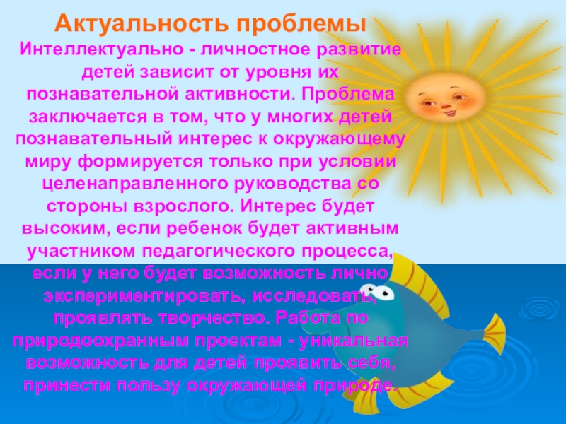 активности. Проблема заключается в том, что у многих детей познавательный интерес к окружающему миру формируется только при условии целенаправленного руководства со стороны взрослого. Интерес будет высоким, если ребенок будет активным участником педагогического процесса, если у него будет возможность лично экспериментировать, исследовать, проявлять творчество. Работа по природоохранным проектам - уникальная возможность для детей проявить себя, принести пользу окружающей природе.
