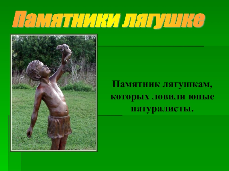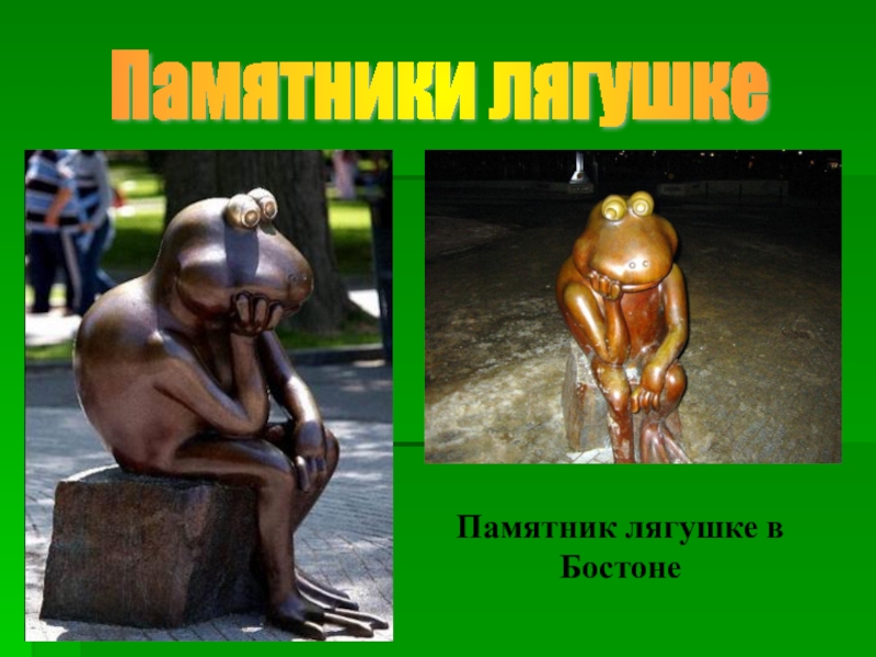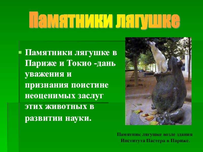 Слайд 12Памятники лягушке в Париже и Токио -дань уважения и признания поистине