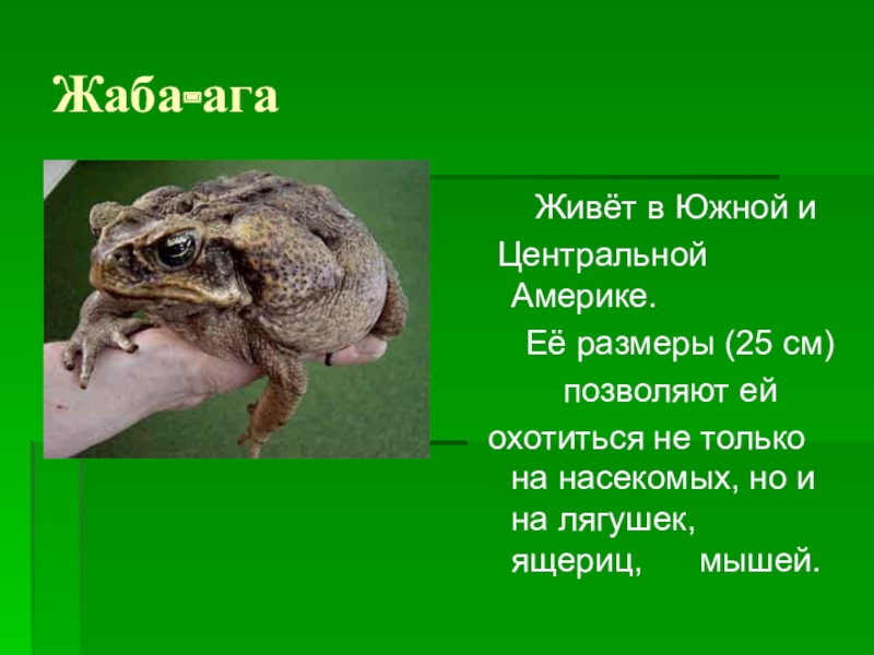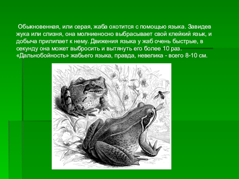 Слайд 25 Обыкновенная, или серая, жаба охотится с помощью языка. Завидев жука